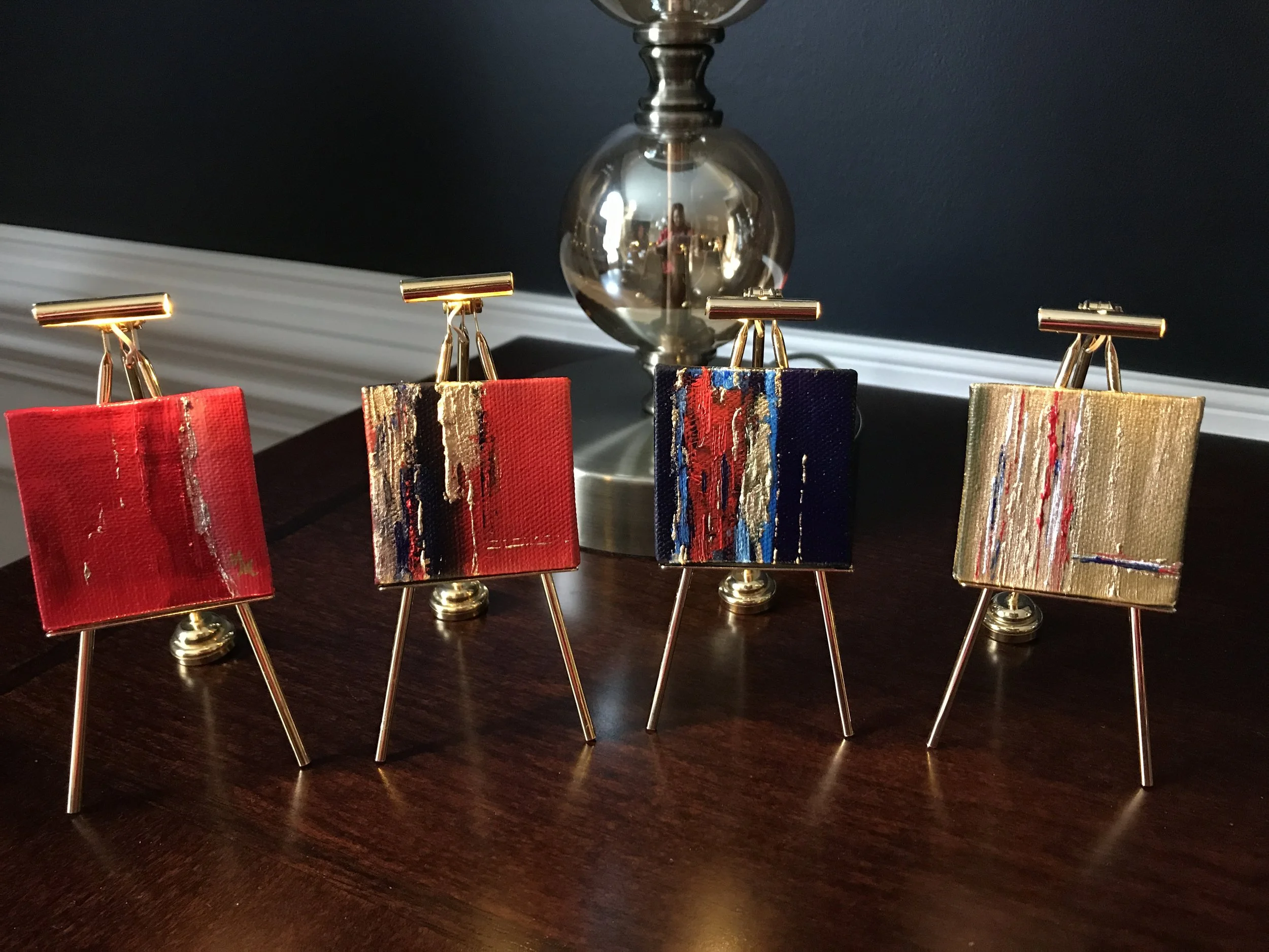 This year for Advent I decided to go quite small. For the last several years I have chosen an Advent theme and painted one piece per week for each of the four weeks leading up to Christmas. As the years have gone on I have chosen to go smaller each year partly for space and partly for fun. This year I went all the way to a 2x2 canvas because I thought it would be challenging, and it gave me the idea to also paint ornaments in the same size for fun inexpensive gifts. Pictured above are the four paintings—”Rejoice!”—”Expectant”—”Love, Actually!” and ““Wonderful Counselor, Prince of Peace!” The fun and challenging part about these pieces was the abstract depiction of quite deep and grand words. The titles kind of chose themselves, meaning as I sat painting the titles just came to me. The excited part was choosing how to share them on social media. I wanted to do something different than I had done before. Because Jack and the kids and I brought out a dollhouse decorated for Christmas as a decoration, I thought it would be the perfect sized place to display these tiny paintings. I even found lighted brass easels that created the perfect mood for the pieces and the house. What a fun activity each week this was! It certainly brought out the little kid in me. Below I will attach of few pictures from my Instagram posts as well as a few more images of the pieces on the easels.