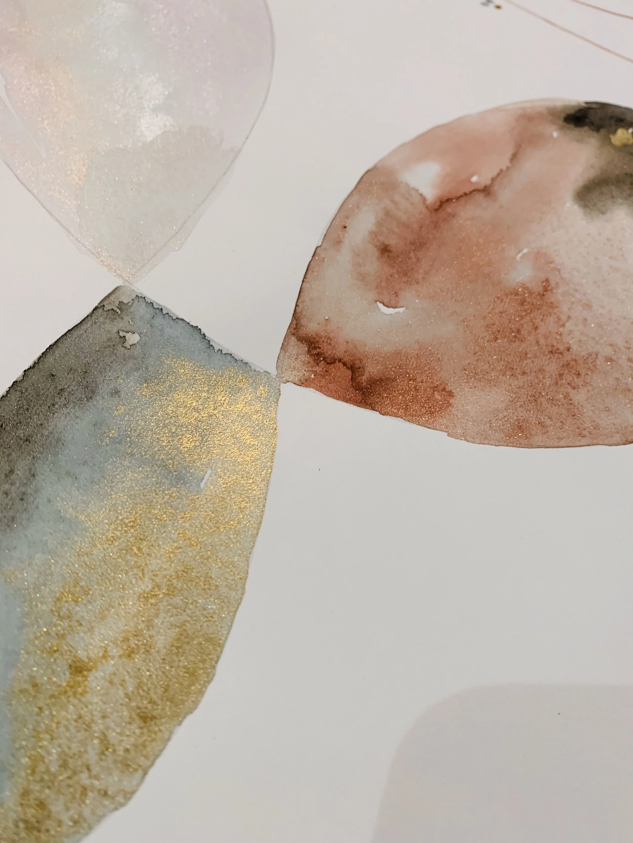 Here is the latest completed example of my new style. I will try to offer some explanation for those interested. As many of you know, my previous abstract pieces, in both oil and watercolor, contained many lines, vertical and horizontal. This new style has curvy ones. I explained how I arrived here in the post, “Why Watercolors”. The feel of this style is all about fun, joy and lightheartedness. It looks like balloons or rocks or gemstones connected by strings. The string represents a person’s life journey. The larger attached shapes are representations of the big moments in our lives —the “big life moments” or the little moments in life that change us in a big way. Everyone has these. These are often illustrated with a timeline. I don’t like to think of things in linear form much anymore, so I’ve chosen to paint them with twists and turns and ups and downs which I find to make much more sense. Sometimes these moments overlap or touch in some way like the big black shape and the teal one in the image below. Sometimes those big or small monumental moments in our lives “spill over” or “go over the line” and affect not just us, but those around us. I will also attach a pic below to show an example of how I paint this.
