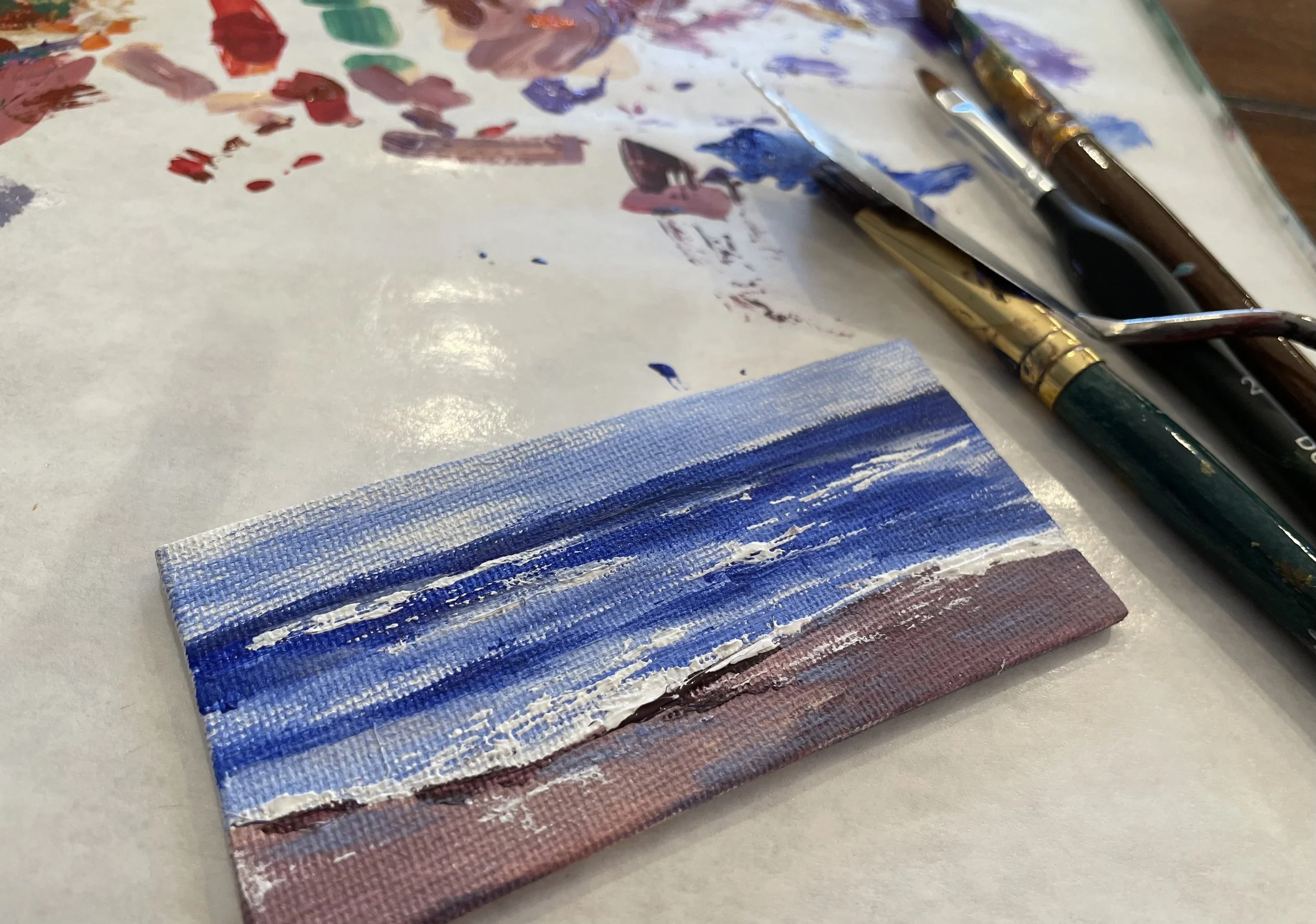 This litttle guy is what I made time for today. It is a little acrylic that hasn’t been sprayed yet, but I show it here because it is what I spent time painting today. It isn’t perfect. It is quite small and painted in acrylic. Using acrylics are different than painting in oils. I prefer painting beaches in oil because of how the paint works. ( But, I wasn’t up for the mess involved with oils today.) Oils stay wet and allow for great blending of colors. I painted this one because I have been sketching so many shores lately that it was time for some paint and color. I love painting and sketching shores. The way the water touches the sand and foams is mesmerizing to me, as well as how the waves build and crash. That changes the way the water looks and moves. I find that fascfinating too. I have spent so much time walking up and down shores memorizing how it acts so that recreating it on canvas and paper has become second nature. I also have more than enough videos of it in my phone. I love painting water of any kind—beaches, streams, ponds, and lakes. The reflecfions on water of any kind even puddles is another fascination of mine. It is those subtle touches and details that make a piece of art come alive. I like to make people notice in a painting what they may in real life overlook.