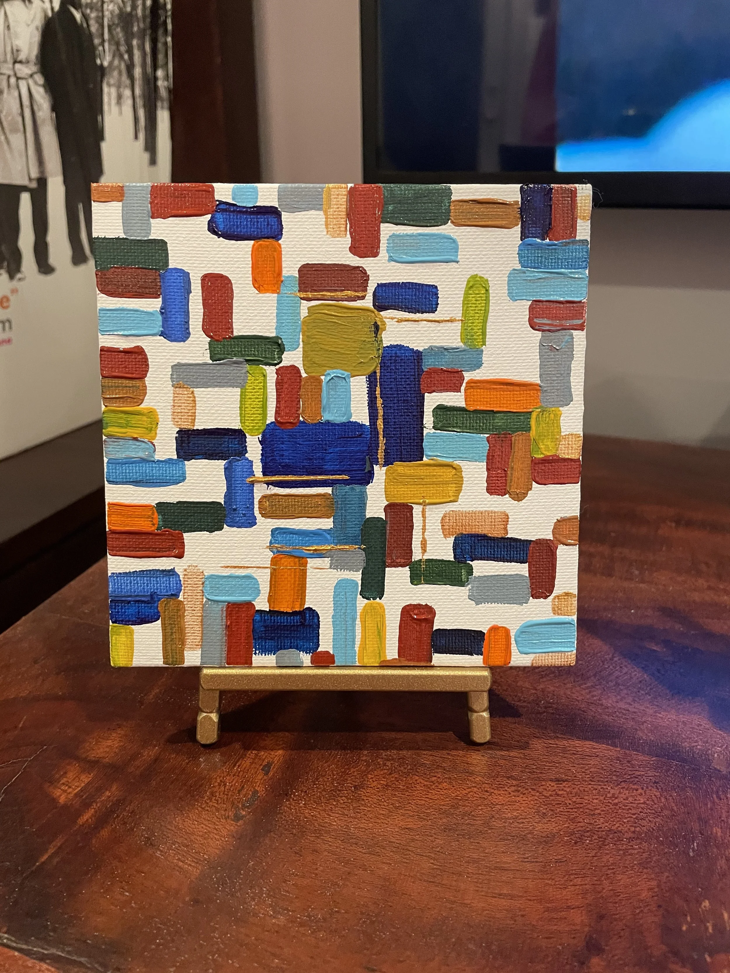 This is a nice 5x5 acrylic mini called “Lessons Learned”. I cannot explain the joy I had painting this piece, I like the colors and the size. I just got a new easel for these minis pictured in the photo below.