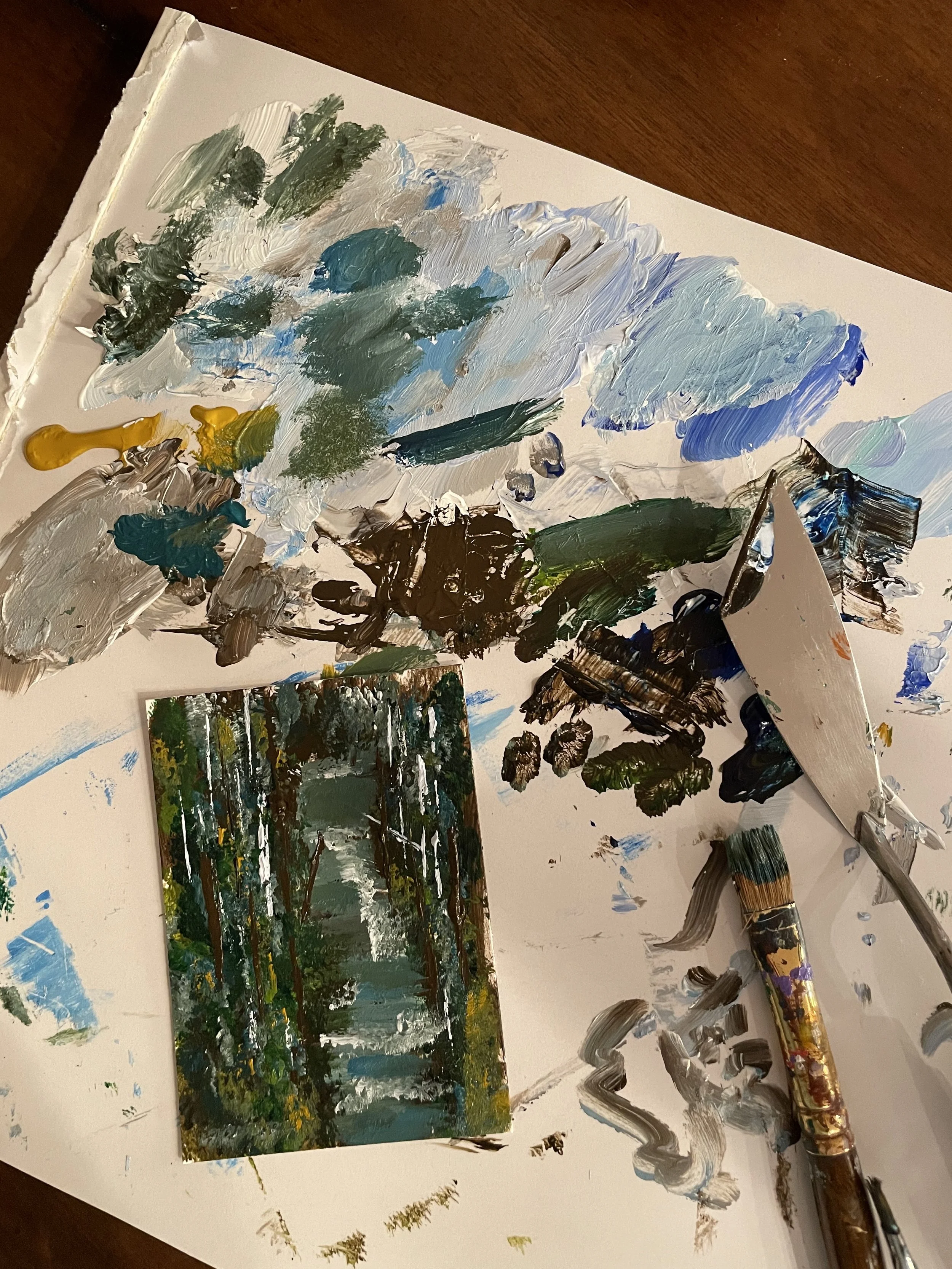 Last night I painted this mini mountain stream on paper. There is something I love about it. It was one of those pieces that seemed to paint itself. I think it looks exactly like the streams we see in the mountains here. I’ve memorized that nature. I love the woods, and I’m crazy about woods with water running through them—living, moving water. I find it spiritual and peaceful. I love a path, but I also love the path made by a mountain stream. They are always different because of the amount and flow of the water.