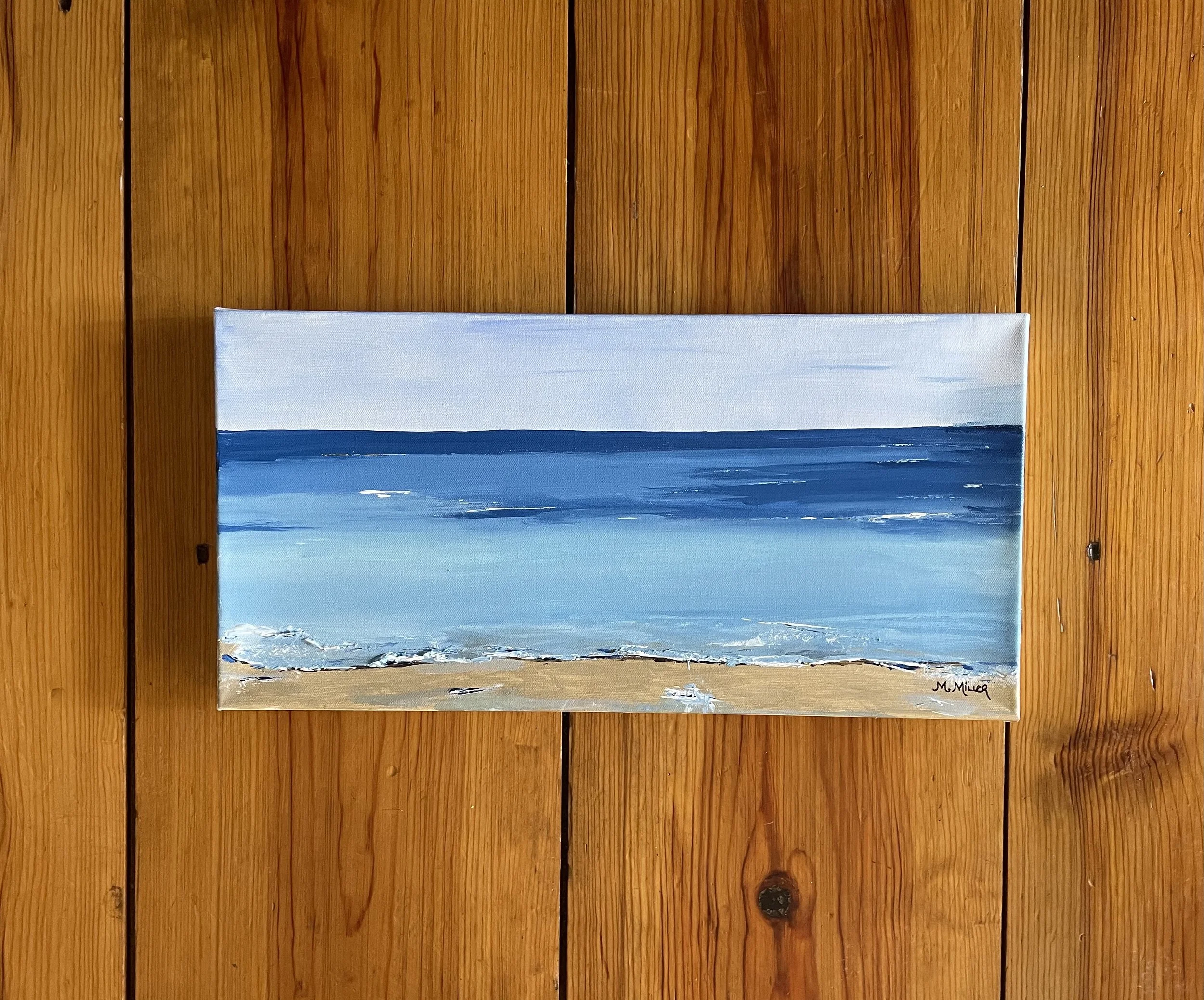 “And, why do you paint so many beaches?” I paint beaches because I like the beach and I like painting it. I also love sharing the beach with others. I painted this this morning for some friends. I don’t ever want to paint a specific beach for recognition. I want the beach I paint to be an “anywhere” beach. I want the observer to bring their memories to any piece. So many people view the beach as peaceful and see it as a place to relax. I want to offer that as best as I can with each piece hoping maybe the observer walks away with a little more joy and peace. The ocean is vast and out of our control. It is good for humans to realize that the world does not revolve around us. The ocean teaches us that with its bigness and with each wave and tide schedule. It can be calm or wild if a storm is approaching. It rarely ever looks the same—different lighting, different clouds, different movement, different tide revealing more or less sand, shells, rocks and wildlife. I want to offer all of this as best I can with every piece—peace, calm, perspective, and reminders.