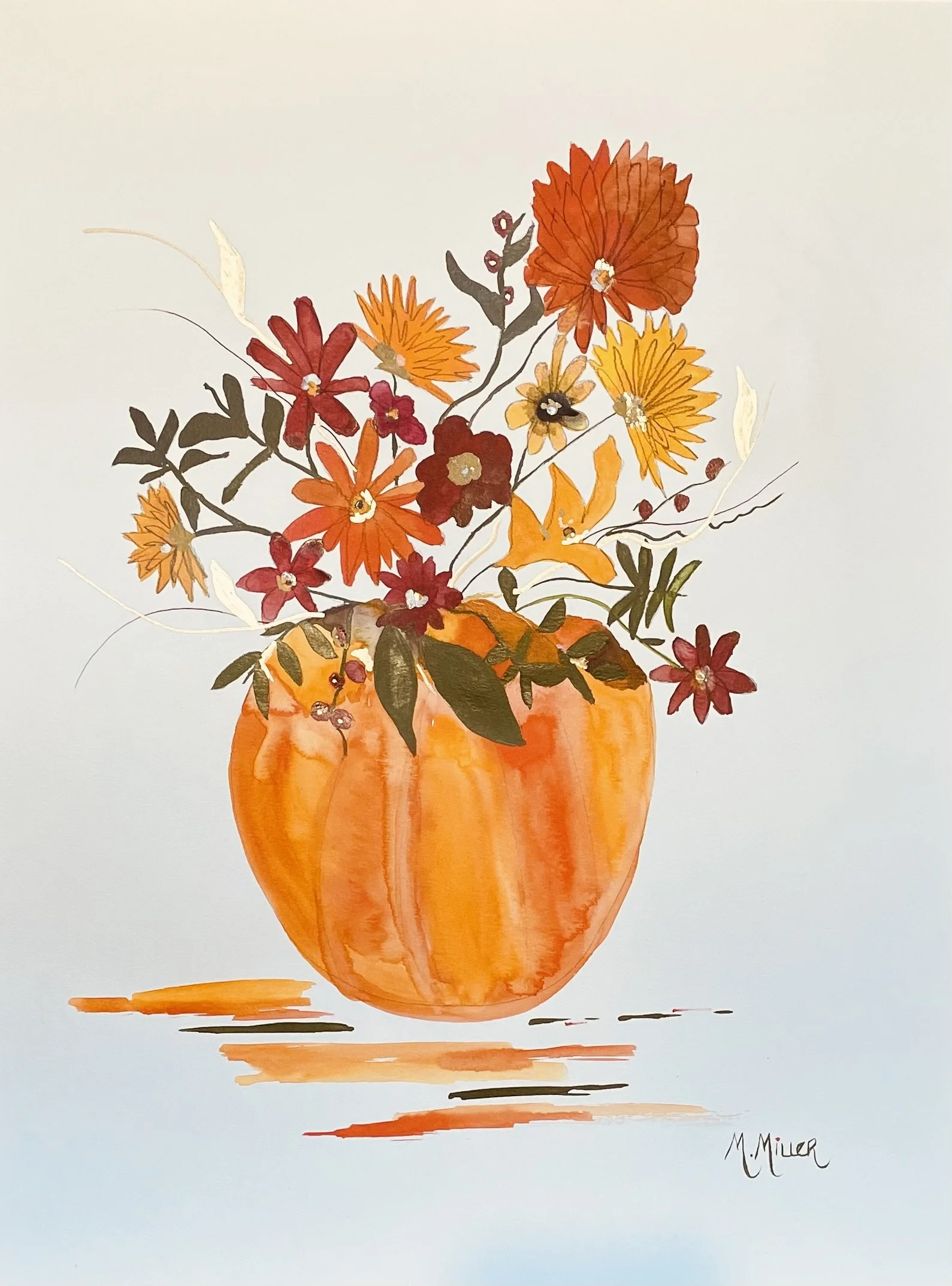 I painted this one day in my studio as I was in the fall spirit. I created this piece as I would a nice pumpkin floral centerpiece. This piece is painted on white watercolor paper, but lighting in my studio makes taking photographs with the correct coloring difficult.